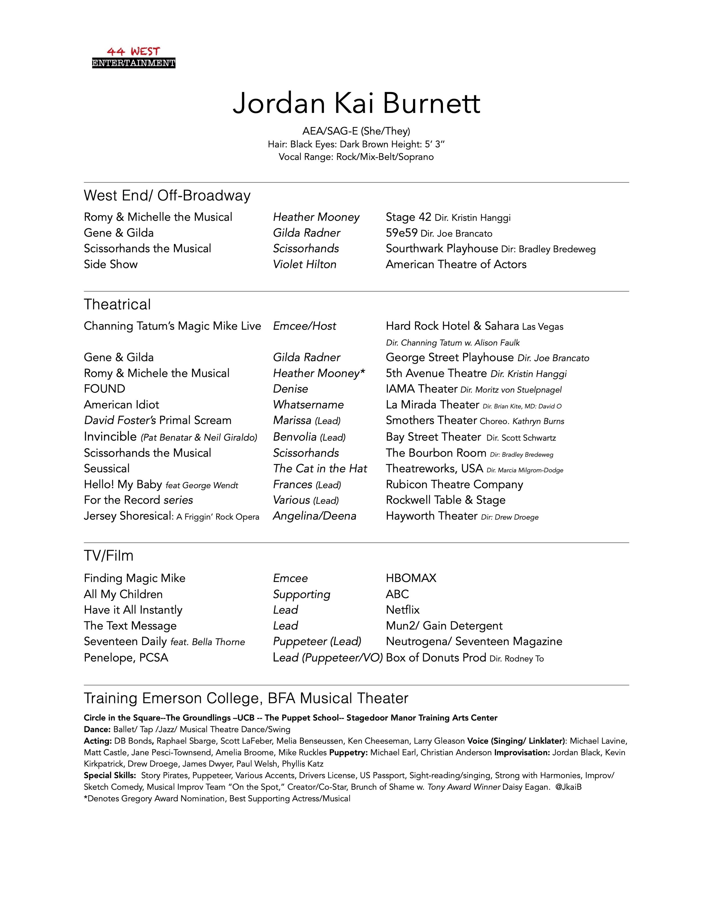 Favorite credits include: Found- Denise (West Coast Premiere, IAMA Theater Company directed by Moritz Von Stuelpnagel.) American Idiot- WhatsherName (LA Premiere),